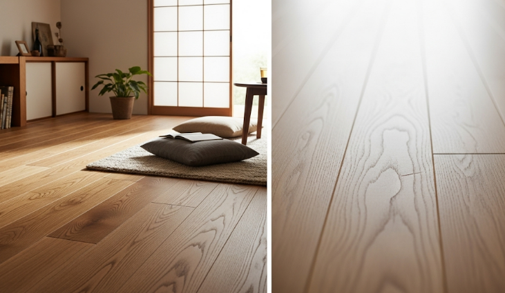 - **素材構成**: 無垢床は単一の木材、標準仕様(複合フローリング)は合板+化粧材。