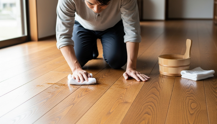 年に数回は、無垢床専用のクリーナーで汚れを落とし、オイル仕上げであればオイルを、ウレタン塗装であれば専用のワックスを塗布することで、より長く美しさを保つことができます。これにより、表面の保護効果が回復し、光沢もよみがえるでしょう。