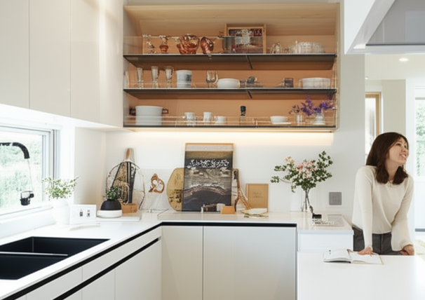 お気に入りの食器や小物をディスプレイすることで、キッチンが単なる作業場ではなく、住まいの中心となるおしゃれな空間へと変貌します。