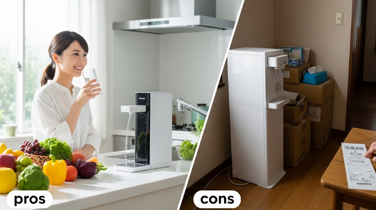 まず、メリットとして挙げられるのは「手軽に美味しい水が飲める」ことです。いつでも冷水や温水が利用できるため、飲料水としてはもちろん、料理やお茶、コーヒーなどにもすぐに使えて非常に便利です。特に夏場や冬場には、その利便性をより強く感じられるでしょう。