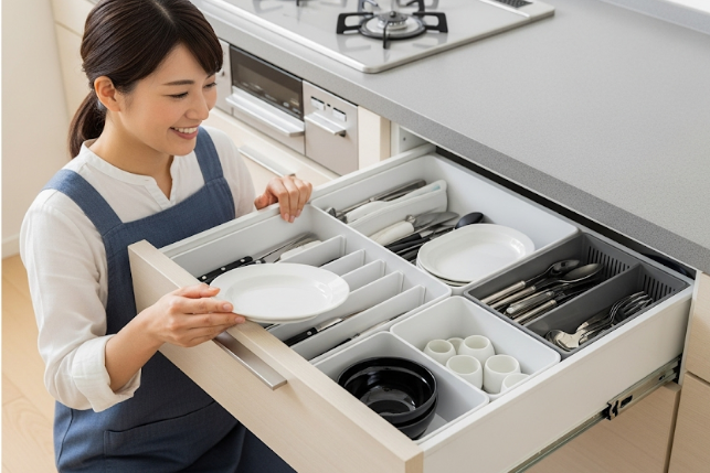 さらに、引き出しの内部には、カトラリーや調理器具を整理しやすいように、標準でトレーが付属している点も嬉しいポイントです。
