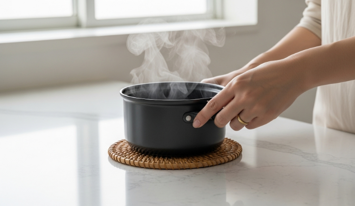 クォーツストーンは、樹脂(レジン)で固められているため、極端に熱い鍋などを直接置くと、変色や破損の原因となる可能性があります。